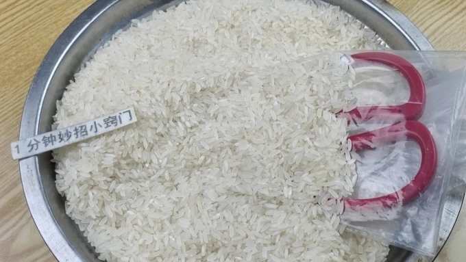 Các dụng cụ bằng sắt thép trong nhà như dao kéo để một thời gian dễ bị oxy hóa. Bạn nên dùng màng bọc thực phẩm để bọc lại, sau đó cắm vào gạo ngăn tiếp xúc không khí. Vì kéo đã được bọc màng bọc thực phẩm nên không lo gạo bị nhiễm bẩn.